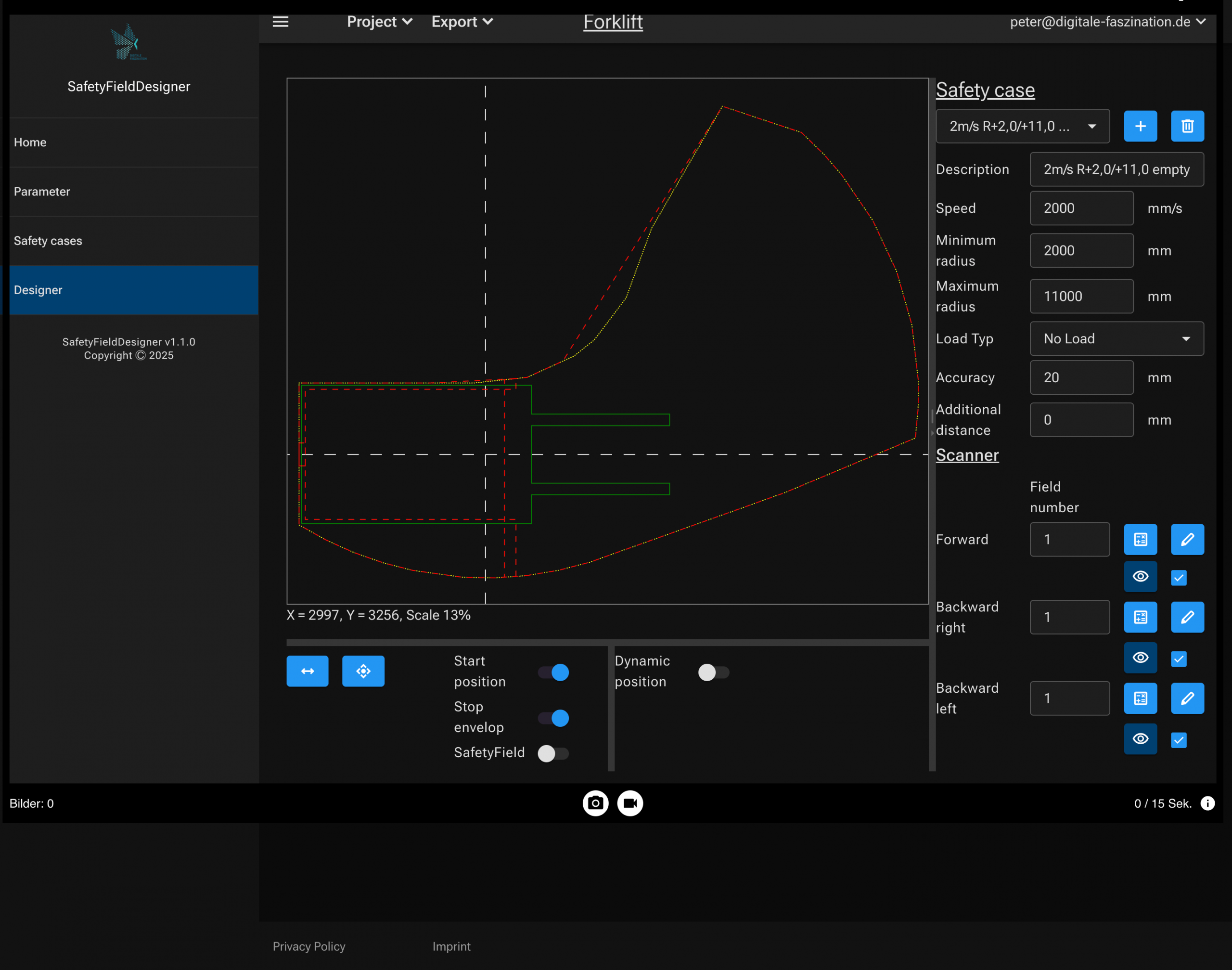 Basierend auf dem kinematischen Modell “Differential-, Dreirad- oder Ackermann” kann die Kontur eines mobilen Roboters nahezu originalgetreu modelliert und visualisiert werden. Parametrierbare Antriebsparameter ergänzen das kinematische Modell und erlauben eine detailgetreue Simulation des Fahrverhaltens. Je nach Bedarf kann der Benutzer optional eine oder mehrere Konturen für zu transportierende Nutzladungen anlegen und visualisieren. Mobile Roboter – speziell im industriellen Umfeld – benötigen eine sicherheitstechnische Absicherung. Das Tool bietet hierfür eine Vielzahl an Auswahlmöglichkeiten verschiedener Sicherheitslaserscanner diverser Hersteller in diversen Konfigurationen. Ein, oder mehrere Scanner können frei parametrierbar in beliebigen Ausrichtungen platziert werden und komplettieren die detailgetreue Nachbildung des mobilen Roboters. Anhand vordefinierter Fahrszenarien lässt sich das Fahrverhalten simulieren und in allen erdenklichen Situationen analysieren. Die tatsächlich “abgefahrene” Wegstrecke und die “überfahrene” Fläche wird visualisiert. Die wahre Stärke beweist das Tool bei der Berechnung und Visualisierung der sicherheitstechnisch erforderlichen Schutzfelder. Die Felder werden basierend auf der tatsächlich “überstrichenen Fläche” ermittelt und beziehen Parameter, wie z.B. Reaktionszeit, Zuschläge für Fußschutz, frei konfigurierbare Zuschläge, usw. In die Berechnung mit ein. Die final ermittelten Feldsätze können exportiert und im vorausgewählten Scanner als Datei-Import geladen werden! Aktuell werden die Sicherheitslaserscanner nanoScan3, microScan3 und outdoorScan3 von Sick unterstützt.